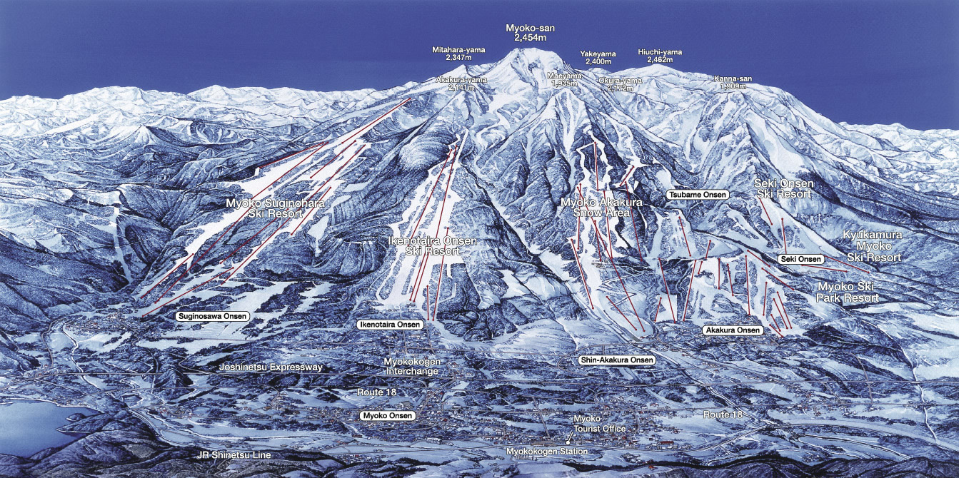 - 由九個雪場組成,妙高杉之原、池之平、赤倉觀光、赤倉溫泉是熱門雪場
